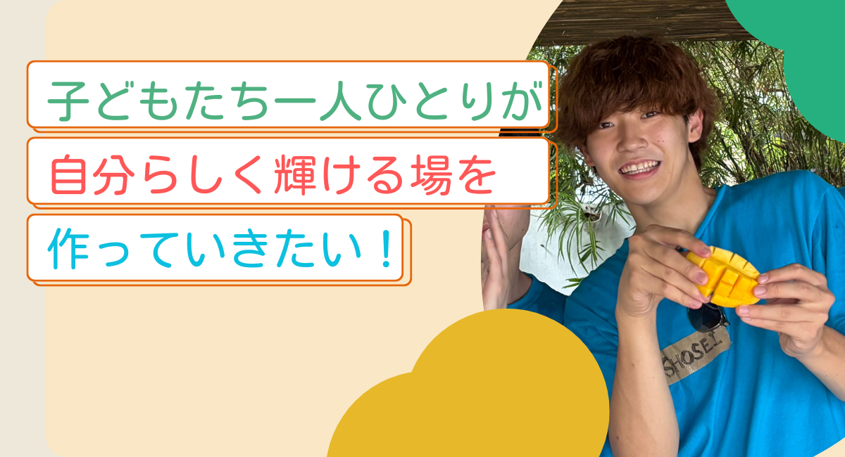 私は、子どもたちにとって「気軽に話せて、気が合う年の近いお兄ちゃん」のような存在でありたいです。好きなことや悩みを安心して話せる関係をつくりたいと思っています。私自身も好奇心旺盛で、いろんなことに興味を持つタイプなので、子どもたちの「これやってみたい!」という気持ちに共感しながら、一緒に楽しみたいです。失敗しても「大丈夫!」と笑い合えるような空気を大切にし、子どもたちが「これってけっこう面白いかも」と思える何かを一緒に見つけていけたら嬉しいです。